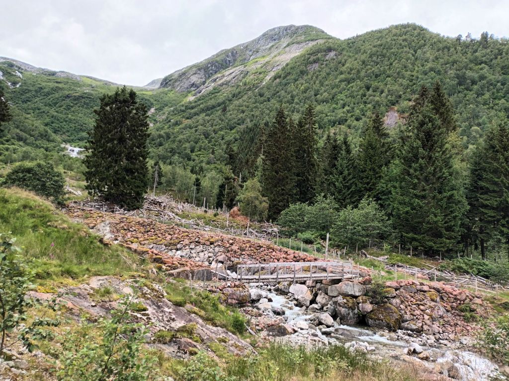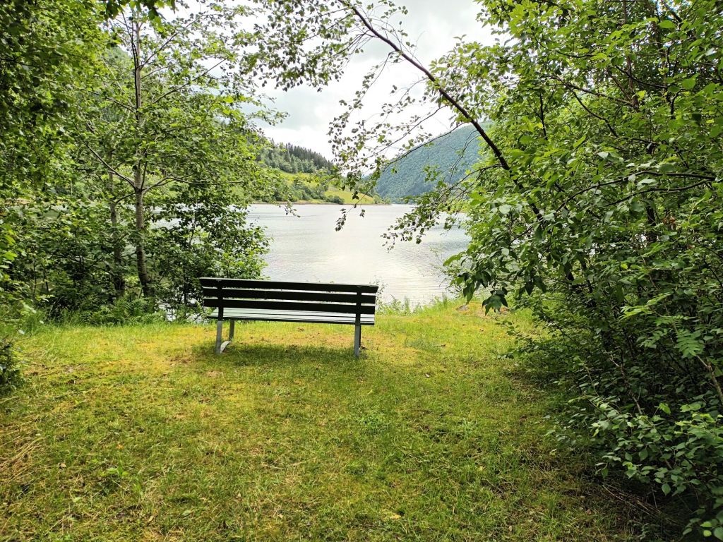 I picked up a map of hiking trails from the Tourist Office and walked up to the head of Ese Fjord to check the location of some of the trails. Couldn’t resist sitting on this bench for my lunchtime snack. Just beyond this was the start of the path up Keipen, the first part of which is shown as Moderate. I didn’t have my hiking pole, so I walked only a little way up this. Returning I found that the entrance to the moderate trail up Esedale is only about 2km from Balestrand, and a bus stops outside.