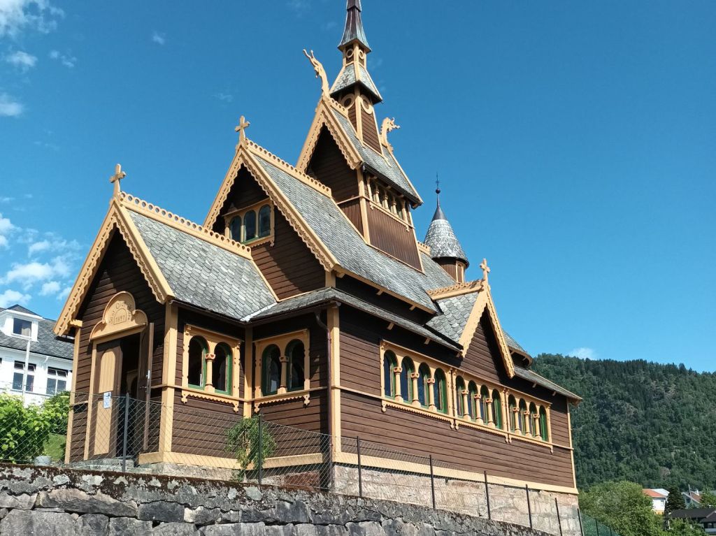 I went to Vik on the other side of Sogne Fjord to make good use of my 7-day bus pass before it expires. Unfortunately, I missed the connection – either I was not quick enough getting off the car ferry or it didn’t show up – and had to walk 10 km to Vik. The Tourist Office advised me that the Stave Church was just 1.5 km away, the Stone Church a bit farther. There’s a cultural trail which includes both, so that added up to another 5 km.