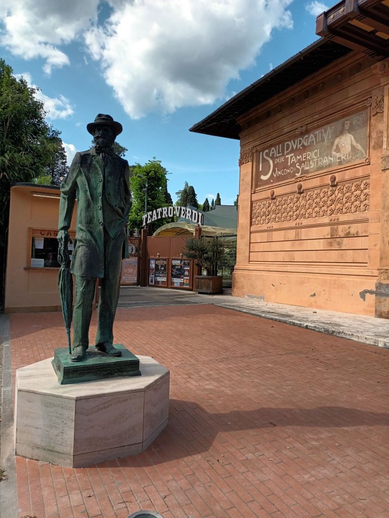 By the time I had switched off Flight Mode to find out what the time really was and unpacked, there was only about an hour before our 3 pm walk round Montecatini. It’s a spa town, developed under Victor Emmanuel II following the Unification of Italy in the mid 19th century., and was visited by several famous musicians, Verdi and Puccini being the only ones I’d heard of. There are metal statues of both; this one is Verdi.