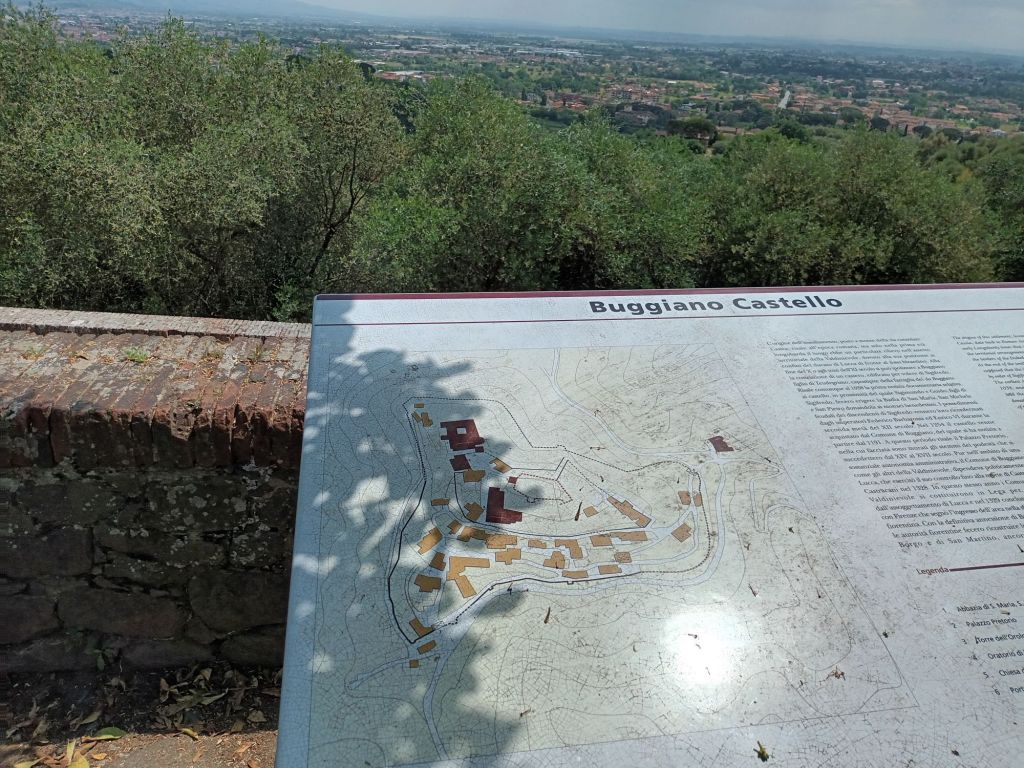 We could see Buggiano Castello, where we would stop for lunch, above us, but we had to go down and cross an old bridge before climbing again. We skirted the settlement, probably Roman according to the display board, and arrived at the restaurant, where we found six elderly men sitting round a table. We wondered if they came here every Thursday to get away from their wives. However, they were friendly, and interested in our walk.
