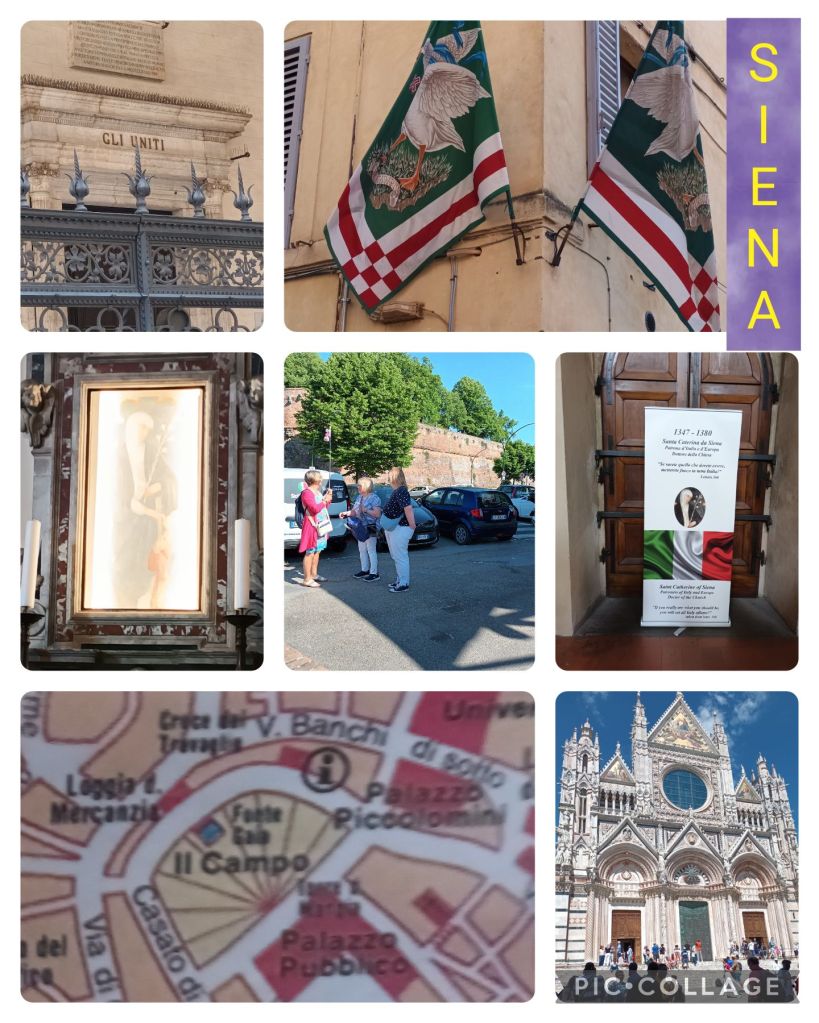 The coach dropped us off by a fortress, and we passed a flower market on the way to San Domenico, an enormous brick church. Children were arriving for their First Communion service, and it seemed strange to be entering the church as tourists on this important day of their lives. However, we did, and prayed together by the relic if St Catherine’s head, her body being buried in Rome.