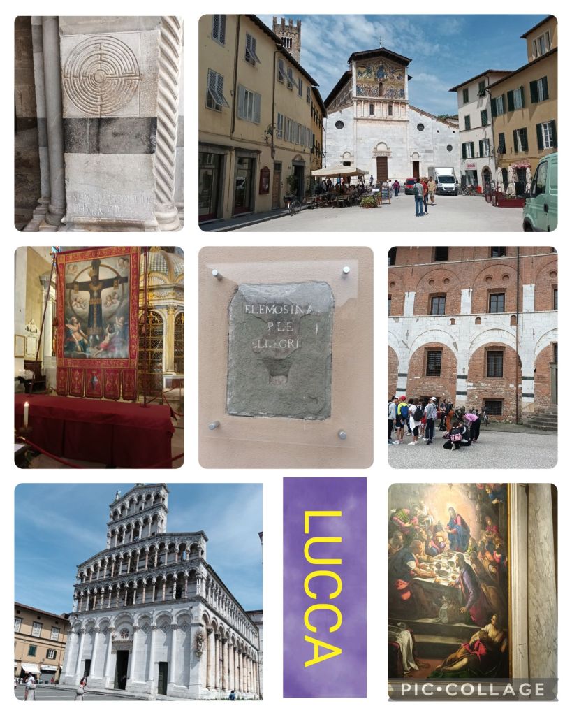 A quieter day, after the very crowded (in both space and time) cities of Florence and Siena. Lucca Cathedral didn’t object to backpacks, and provided stamps for the Pilgrim Passports Michael had made for us. Unlike most of the places we are visiting this week, Lucca is on the Via Francigena, though I wouldn’t have guessed it. The middle picture in the collage shows an almsbox collecting money for (and possibly from) pilgrims, outside the medieval pilgrim hospital.
