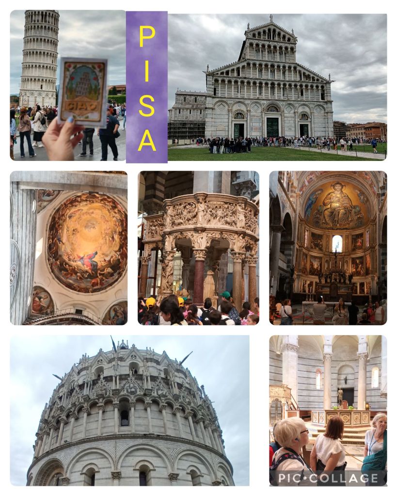 Walked through streets busy with huge groups from cruise liners, then among market stalls, with those of us who had been here before commenting how tacky Pisa had become. We met our guide, David, at the Field of Miracles. I tried to take a photo comparing the cross-stitch cover of my notebook with the real leaning tower, but the light wasn’t good enough.