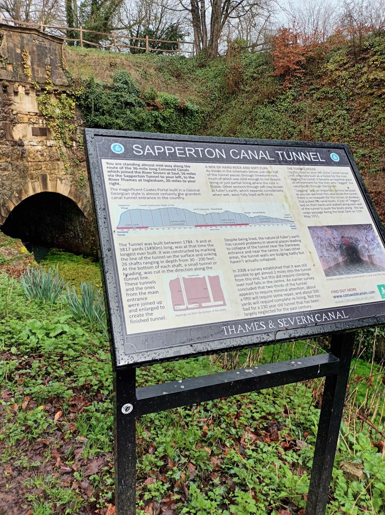 The route followed the Thames-Severn canal, running alongside the river Frome, past demolished locks. At Sapperton, it disappeared into a tunnel, reappearing several miles later, and drying up altogether at a place where the path was covered in puddles every few yards.