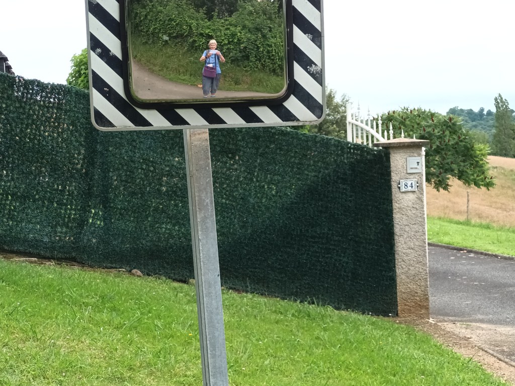All was well as long as the route followed tarmac roads. At the point where one became a stony track, there was a notice “Route Barrée”, and investigation showed that this even applied to walkers. I backtracked to the D road, where I met another walker and told her the bad news. She wanted to see the problem for herself. I never saw her again, so I don’t know if she managed to fight her way through the blockage, decided to give up the walk, or took the same detour as me.