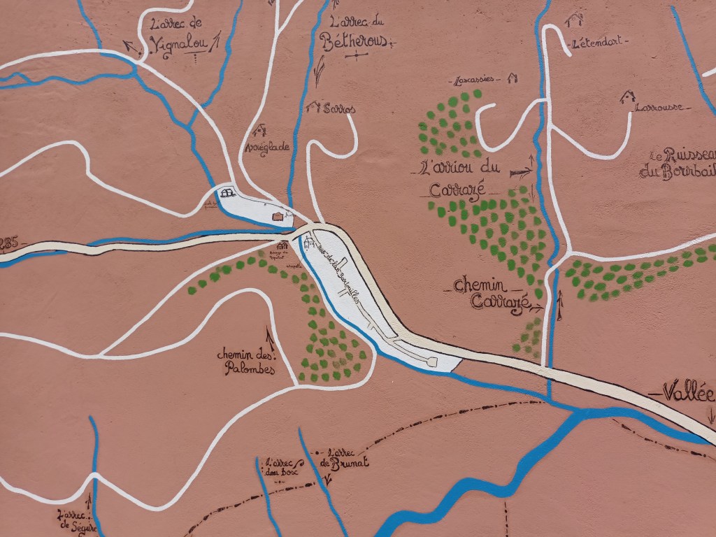 At another hairpin bend, a school had made good use of its pelote wall to make a useful map of the area, making it clear that I should turn left into the woodland immediately after passing the school.