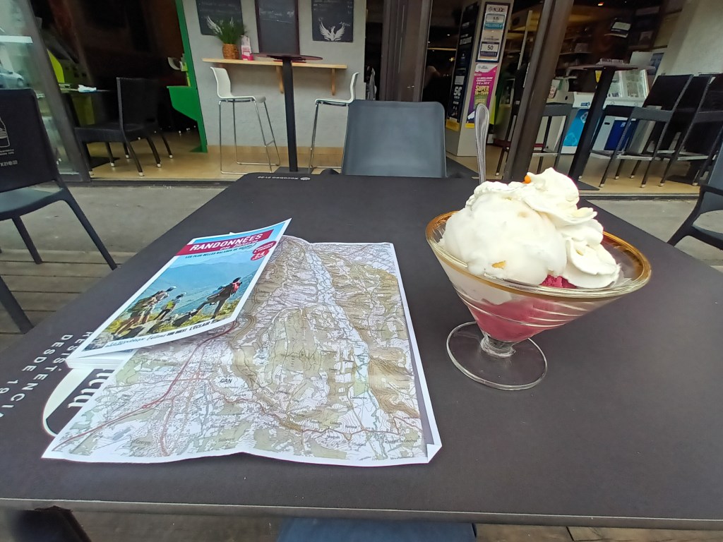 Feeling rather hungry after walking nearly 11 miles, I headed for a restaurant on the main square and asked for the “menu du midi”. I was too late; it was two o’clock and all the food had gone, but they could probably find me a plate of charcuterie. That sounded much too salty, so I asked if they had ice cream. Yes. Lemon and blackcurrant sorbet with whipped cream.