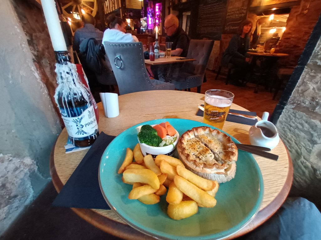 I reached the Crown Inn in time to have a bath (rare treat!) before dinner – vegetarian meatballs and lemon cheesecake with rhubarb crumble ice cream. Met a visitor from New Zealand who thought I was an inspiration.